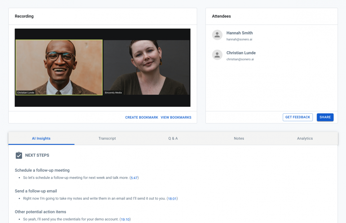 Sonero makes meetings much more efficient and productive using AI. The tool transcribes your video meetings into intelligent summaries, covering the key insights such as next steps, action items, conversation highlights and talking points. Using these intelligent recaps, you can easily search across all your meeting conversations, highlight key moments and share them automatically with your team to level up your productivity.